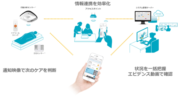 「HitomeQ ケアサポート」は,居室の天井に備え付けた行動分析センサーで入居者の行動を解析し介護スタッフのスマートフォンに映像とともに通知,転倒事故発生時にエビデンス映像の自動記録,ケア実施後すぐにスマートフォンで簡単入力できるケア記録などの機能を備えている。これにより,介護スタッフのワークフローを変革し,業務を効率化させることで余裕時間を生み出し,入居者のQOL(生活の質)を向上する充実した介護の実現に貢献している。