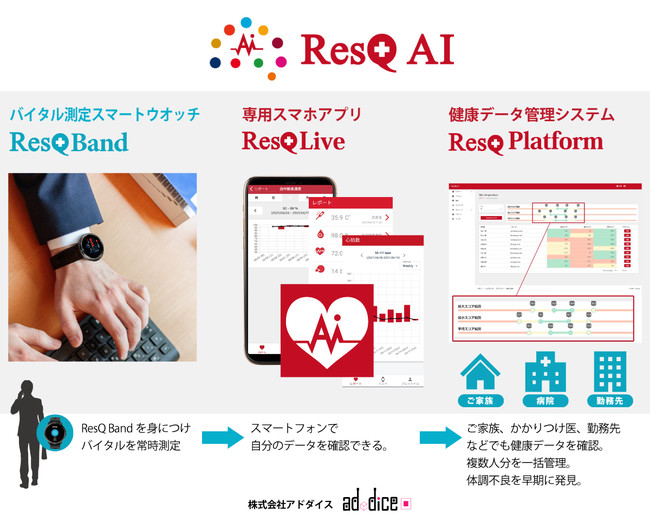 (株)アドダイスは,2021年6月1日より,愛媛県上浮穴(かみうけな)郡久万高原町「久万高原町立病院」において,バイタル測定スマートウオッチ「ResQ Band(レスキュー・バンド)」および健康を見守る人工知能「ResQ AI(レスキューAI)」を利用した,地域の高齢者及び病院スタッフの健康見守りの実証実験をスタートした。