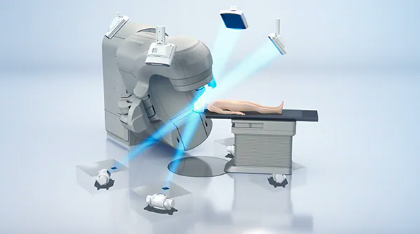 4組のX線管とフラットパネルディテクタ(FPD:平面検出器)により,放射線治療装置のガントリ角度に関係なく必ず2方向からのX線撮影が可能で,高精度に位置合わせができる。治療開始前だけでなく,治療中の補正も短時間で対応できる。