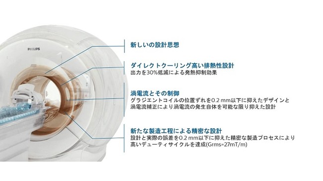 「Ingenia Elition X」に搭載される「Vegaグラジエント」コイルは,緻密に計算されたコイルデザインとダイレクトクーリングにより , 渦電流の改善や高い排熱性 を可能にし , シグナルロスの軽減や短時間撮像 ,そして高空間分解能化を可能にする(図1)。 従来と比較して 60%[3]の空間分解能の向上が期待できる 。また,渦電流を最小限に抑えるグラジエントデザインにより,Diffusionのイメージングにおいて30%の撮像時間短縮と70%のコントラスト分解能の向上[4]を可能とする。