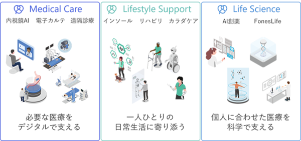 1つ目が必要な医療をデジタルで支える「Medical Care事業」,2つ目が一人ひとりの日常生活に寄り添う「Lifestyle Support事業」,そして3つ目が個人に合わせた医療を技術で支える「Life Science事業」。これら3つの領域での事業を通じ「live as you あなたを知り,あなたらしく選ぶ」世界の実現を目指す。