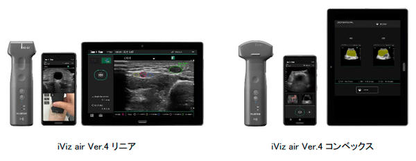 今回発売を開始する「iViz air Ver.4」は,超音波プローブ,本体,オプションソフトを,施設のニーズに応じてより自由に選択し購入できる,柔軟な製品構成を実現した。プローブと組み合わせる本体タブレットは,持ち運びに便利な5.8インチまたは視認性に優れた10.1インチの2種類から選択可能。