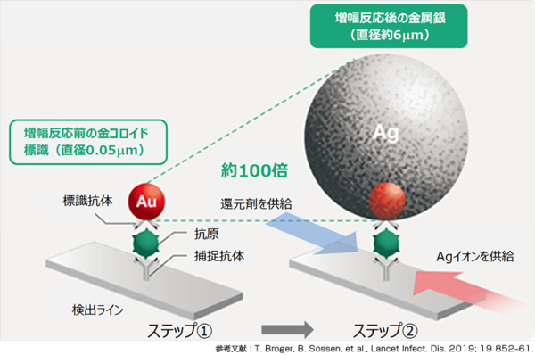 今回提供する検査キットは,この原理を応用。金コロイド標識つき抗体と結合した抗原を,検出ラインに塗布した捕捉抗体が捉え(ステップ(1)),前述の銀増幅反応をコントロールすることで,金コロイド標識があるところにのみ,金属銀を生じさせ,大きな金属銀を形成させる(ステップ(2))。