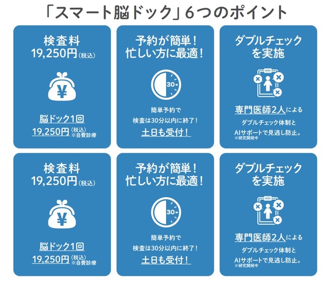 「スマート脳ドック」は,脳動脈瘤や脳梗塞,脳腫瘍などの自覚症状のない脳の異常を早期発見できる頭部MRIおよび頭部・頸部MRAの検査。WEBでの予約と問診票の事前登録,受診結果をパソコンやスマートフォンで確認できるため,クリニック滞在時間を短縮し受付から終了まで30分。撮像されたデータは2名の専門医師がチェックしている。