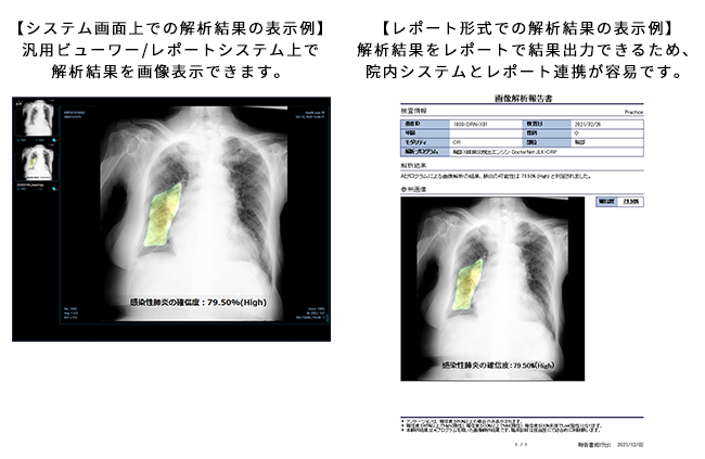 そのような状況において,クリニックや市中病院に広く普及している単純X線撮影装置を活用し,PCR検査等と併せて,感染性肺炎画像所見の有無を適切に抽出することは,COVID-19感染疑い患者の早期スクリーニングにつながることが期待される。一方,放射線診断専門医がいないクリニックや市中病院においては,胸部単純X線画像はCT画像と比較して感染性肺炎の画像所見を適切に読影することは難しく,見落としが多いという点が課題となっている。そのため,放射線診断専門医同等の検出精度により感染性肺炎の画像所見の有無を検出することで,クリニックや市中病院の非専門医の診断を補助し,COVID-19感染による肺炎疑いがある患者の早期のスクリーニングに寄与することを目指して,本申請品を開発した。