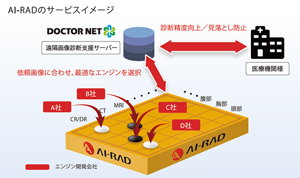 医用画像AIエンジンは対象となるモダリティおよび疾患/病変ごとの開発が必要であり,AIエンジン開発会社1社で全ての領域のエンジンを開発することはできない。そのため,同社が展開する人工知能エンジンプラットフォーム「AI-RAD(エイアイ・ラド)」では,複数社・複数領域のAIエンジンを,同社が遠隔画像診断する年間200万症例を用いて,モダリティ×疾患/病変ごとに評価・選定した上で搭載し,同社の遠隔ネットワーク上で医療機関に提供することを目指している。