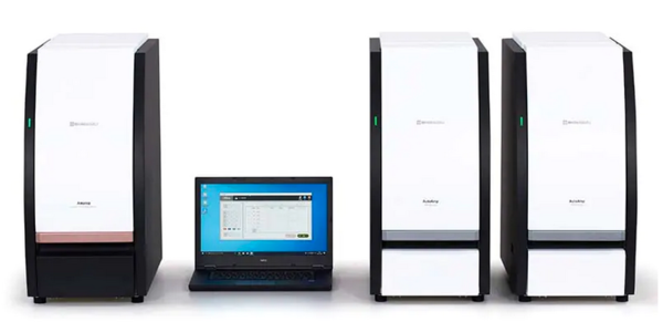 「検体前処理装置Amprep」(左端)と「遺伝子解析装置AutoAmp」(右2台)