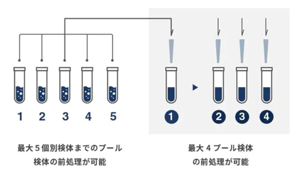 唾液・鼻咽頭拭い液といった検体をセットするだけで装置が自動でプール検体を調製する。ピペット操作など手作業が介在しないため,人為的ミスを防止し,直接検体に触れる機会を減らす。