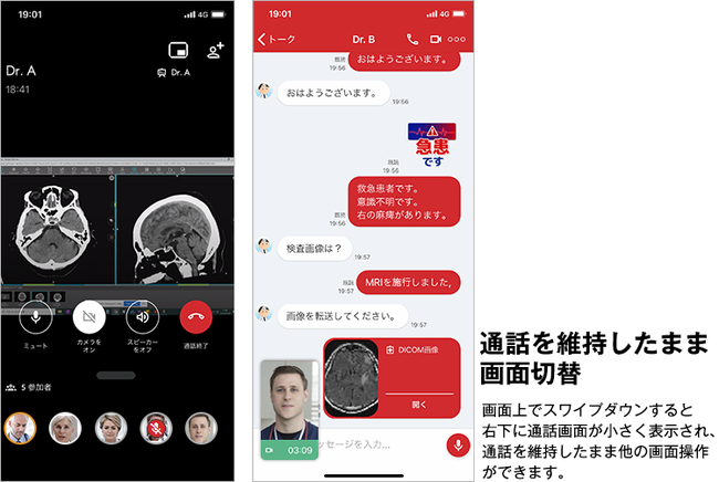 Joinは,アルムが開発・提供する,医療関係者がセキュアな環境でコミュニケーションをとることができるアプリ。標準搭載されたDICOMビューワーで医用画像を閲覧,チャットに共有することで,夜間休日などに院外にいる医師へのコンサルテーションツールとしての活用や,救急患者の転院時の病院間連携・情報共有などに利用されている。本アプリは2016年に日本で初めて保険診療の適用が認められた医療機器プログラム。