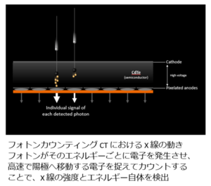 従来までの標準的なCT検出器は,2段階プロセスにより,(1)まずX線を可視光に変換,(2)光センサで可視光を電気信号として検出して最終的な画像を生成する。このプロセスが介在することでX線エネルギーに関する重要な情報が失われ,コントラストは低下し,画像の鮮明さが失われてしまう。しかし,フォトンカウンティング検出器ではX線を可視光に変換するプロセスを排除し,X線の光子(フォトン)をそのまま電気信号に直接変換してから測定している。これにより情報の損失がなく,画像の鮮明さとコントラストが大きく向上する。