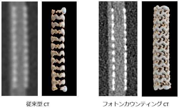 従来のCTとフォトンカウンティングCTでステント画像を撮影すると,画質はフォトンカウンティングCTが大きく上回っている。