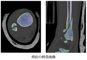 従来のCTでは失われていたエネルギー情報を可視化できるため,骨折部位の中の様子を,カルシウム成分を抜いた画像とともに表示することで,骨折した断面の炎症の有無も確認ができる。このエネルギー情報により体内の物質を特定することができ,関心領域を遮るものがあれば,画像から削除することも可能。