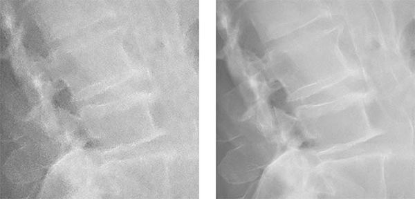 キヤノンはこれまでも,X線デジタル撮影におけるX線量低減に関する検討とともに,画像のノイズ低減のための取り組みを行ってきた。キヤノンの従来のノイズ低減処理はルールベース方式を採用し,X線画像におけるノイズの特徴を基に構築された一定のルールに従ってノイズを低減している。この方式ではノイズ処理性能に限界があり,撮影部位や条件によっては粒状感の改善を優先すると被写体の鮮鋭度が低下するなどの課題があった。