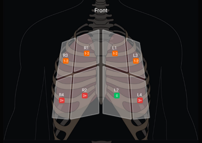 新型コロナウィルス感染症の拡大に伴い,肺エコーのニーズが高まっている。「B-Lineカウンティング」機能は,肺炎などで発生するB-lineを自動計測し,リアルタイム表示します。客観的かつ視覚的なデータは,COVID-19症例の重症度評価に役立つ。