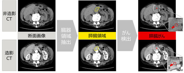 今回の共同研究では,造影剤を用いて対象の臓器を見やすく撮影した画像(以下,造影CT画像)だけでなく,非造影CT画像からでも,膵臓がんの疑いがある部位を検出するAI技術を確立し,膵臓がん患者の早期発見を支援する。