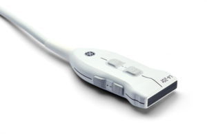 また,一部のリニアプローブ*はボタンプローブ方式を採用しており,プローブに設けられた4つのボタンに好みの機能をカスタマイズできる。両手がふさがってしまう状況下でも,手元で『フリーズ』,『カラードプラのON/OFF』,『深さの調整』などの調整することが可能となる。