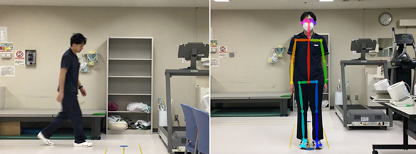 一般的に関節の位置情報を検出する際には,特殊なスーツの着用やセンサーを体に取り付ける必要があるが,今回のシステムではそれらは一切不要で,患者が機器の着用に影響されることなく通常の歩行を撮影することが可能。また,棒人間のデータ(関節の位置情報)に置き換えることで個人情報に配慮されたデータとして扱うことができる。