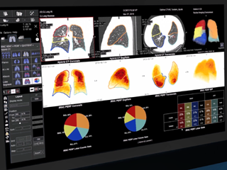 Q.Lung AIは,ディープラーニングによって学習したデータを活用して肺の区域分け処理を行った後,肺換気・肺血流SPECTの区域ごとのボリューム,アップテイクなどの肺機能を定量評価できるアプリケーション。さらに肺換気・肺血流SPECT,Fusionのレビューおよび解析を1つのソフトウェアで完結することでワークフローを簡略化する。