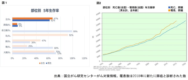 膵癌は最も予後不良の癌の一つで,全体の5年生存率は8.5%と報告されている(図1)。がん統計では膵癌による死亡数は女性で3位,男性で4位,年罹患数は42,361人,今後も更なる増加が予測されている(図2)。さらに,膵癌のリスク因子とされる膵嚢胞性疾患も増加しており,精査対象となる患者が増えている。