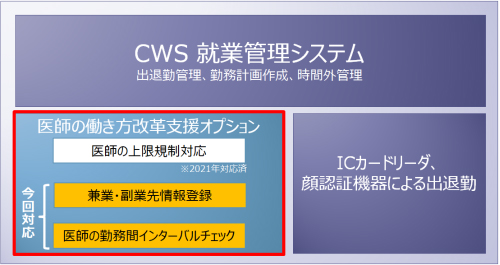 同社は,2014年から医師や看護師の勤務時間を管理する医療機関に特化した就業管理システム「CWS」の販売を開始し,現在全国250を超える医療機関で利用されている。すでに2021年に対応している医師の勤務時間上限規制に加え,今回,CWSに副業・兼業も考慮して勤務間インターバルを把握し,規制に違反する可能性があれば管理者にアラートで通知することが可能なオプション機能を追加する。