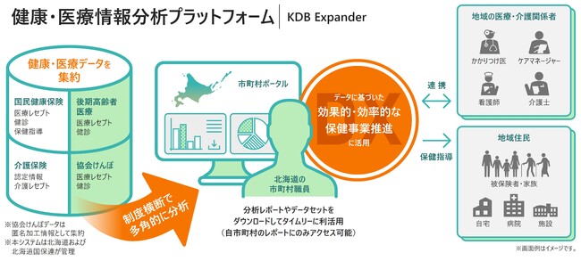 北海道国民健康保険団体連合会(以下「北海道国保連」という。)と(株)日立製作所(以下「日立」という。)は,北海道主導のもと,2020年度より3ヵ年計画で共同構築してきた「健康・医療情報分析プラットフォーム:KDB Expander」(以下「本システム」という。)を,2023年4月より本格稼働する。健康寿命の延伸や医療費適正化を目的に,北海道および道内全179市町村において活用され,全世代型予防・健康づくりの推進を支援する。