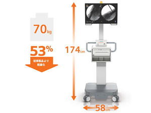Cios Fitのモニターカートは従来製品(Cios Select)と比較して,53%軽量化した。重量は70Kgで動かしやすい設計なので,片手で簡単に移動することができ,手術室内や手術室間との移動の負担を軽減する。