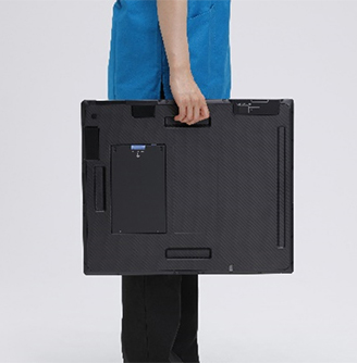 FPD内部のフレームにはマグネシウム合金,表裏のカバーにはCFRP※7を採用。均一荷重に対しては310kg,φ40mmの局所荷重に対しては,100kgの耐荷重強度を確保している。裏面に,指をかける凹み(最深 約9mm)を設け,滅菌ビニールを掛けた状態でも,指が楽にかかる持ちやすいデザイン。また,角や側面のラウンド形状により,平置き時からの持ち上げや患者とベッドの間への挿入がスムーズに行える。