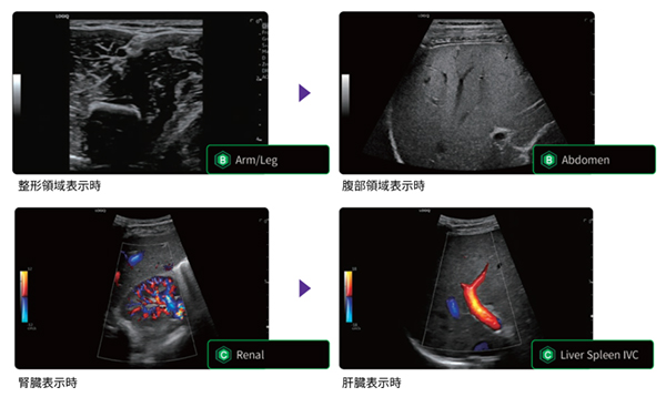 画像を解析した結果から,検査部位に適切な画質設定に切り替える機能や臓器に合わせて適切な血流設定を表示する機能を搭載し,検査の効率化に寄与する。ルーチン検査に使用する時間を短縮し,より時間をかけなければならない症例に注力できるよう,検査の効率化・検査時の負担低減を実現する。