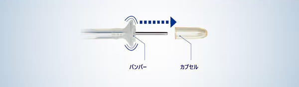 「イディアルボタンZERO」は,従来に比べて手技の安全性をさらに高める独自の設計を実現している。通常カテーテルは留置時の意図しない抜去を防ぐため,先端のバンパー(胃内部ストッパー)が挿入ルート(ろう孔)よりも大きくなっているが,「イディアルボタンZERO」は,バンパーをカプセルに収納する独自の構造にすることで,スムーズな挿入をサポートし,腹腔内誤挿入のリスク低減に寄与する。挿入後はカプセルを胃内に脱落させバンパーを展開することで,カテーテルを留置する。