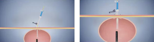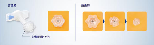 また,「イディアルボタンZERO」は,独自の技術により,シリコンの膜と形状記憶ワイヤのリングにより形成したバンパーを採用している。これにより,留置時は形状記憶ワイヤのリングが展開していることにより意図しない抜去を防ぎ,交換時にカテーテルを抜去する際には,形状記憶ワイヤを先に引き抜くことでバンパーにはシリコンの膜のみが残る。シリコンの膜は折り畳まれた状態で回収できるため,カテーテル交換時の患者の苦痛軽減に寄与する。