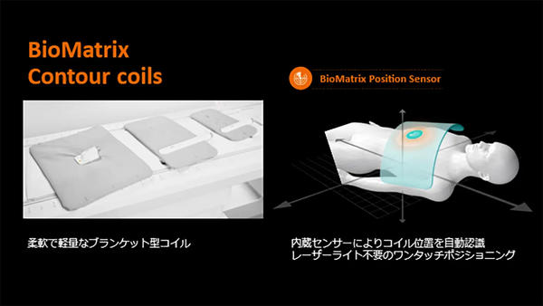 被検者に装着するブランケット型コイルBioMatrix Contour coils に,新たに開発したポジションセンサーBioMatrix Position Sensor を搭載した。内蔵されたセンサーからコイルの位置情報を自動認識するため,レーザーライトを表示して撮像位置を合わせる操作が不要になる。さらに,Body モデルを学習したAIにより撮像位置を自動認識する機能を組み合わせることで,全身撮像のポジショニングを1回のタッチ操作で完了できるため,検査前の準備時間を短縮することができる。また,AI による自動撮像支援機能myExam AutoPilot により,頭部,脊椎,膝のルーチンMRI 検査は1回のクリック操作で完了することができるようになり,操作者のスキルレベルに依存せず,効率的で一貫した検査結果を提供する。
