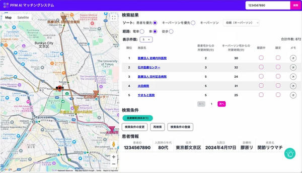順天堂医院では,PFMを取り入れ,入院前の基本情報収集から,自宅療養や地域医療機関への転院調整といった退院支援までを,入院支援センターや退院支援チームが連携して取り組んでいる。しかし,退院先候補を探す既存の退院支援先検索システムは電子カルテと連携がなく,また受け入れ候補先によってはデジタル化が進んでいない医療機関があるなど,調整を行う上で医療従事者に大きな負担がかかっていた。また,過去に候補となった医療機関や,最終的に転院先となった医療機関の情報など,一連のプロセスに関するデータを蓄積・活用する仕組みもなかった。