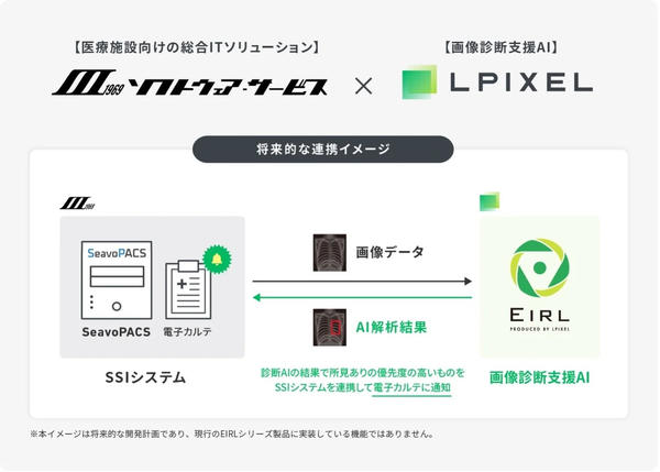 エルピクセル(株)(以下「エルピクセル 」)は,(株)ソフトウェア・サービス(本以下「SSI」)との業務連携を開始した。SSIが提供する医療画像管理システム(PACS)「Seavo」など医療情報システムと連携することで,同社の電子カルテシステム・PACSを導入する医療機関で画像診断支援AI「EIRL」シリーズが利用可能となる。2025年4月11日より開催される国際医用画像総合展(ITEM2025)では,両社のシステム連携についてデモンストレーションを展示予定。