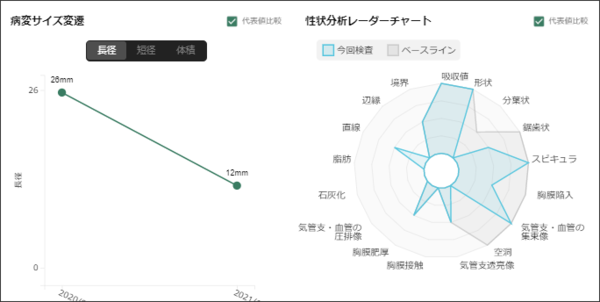 病変の経時変化をグラフ/レーダーチャート化して表示する。