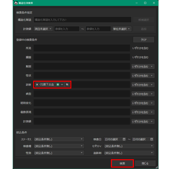 例)「SAH」で検索した際,同義語である「くも膜下出血」などもまとめて検索できる。