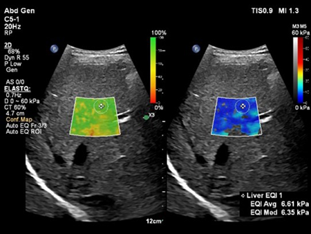 Shear Wave Elastographyを用いて肝臓の硬さを非侵襲的に計測するアプリケーションElastQ(エラストキュー)に,自動化機能が追加された。Auto ElastQは,計測に適したフレームやROIポジションを自動で判別し,計測結果を表示することが可能。これにより,これまで課題であった検査時間を最大60%短縮し[2],99%の再現性が報告されている。[3]