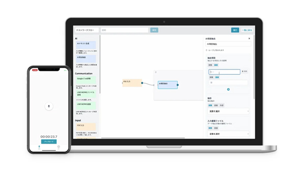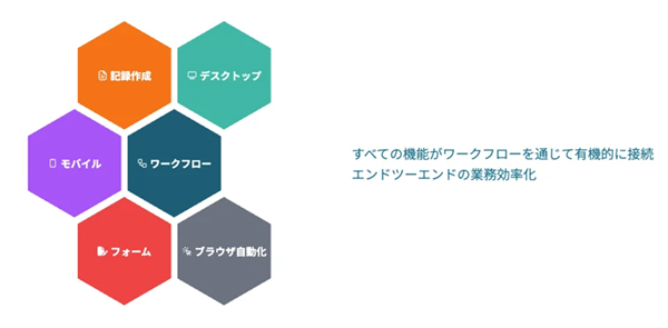 ワークフロー,AI記録作成,デスクトップアプリケーション,モバイルアプリケーション,フォーム作成,ブラウザ自動化,コミュニケーションツール連携といった多様な機能群を提供する。これらの機能がワークフローを中心として有機的に接続することで,個別のタスク自動化に留まらず,エンドツーエンドでの業務効率化を実現する。