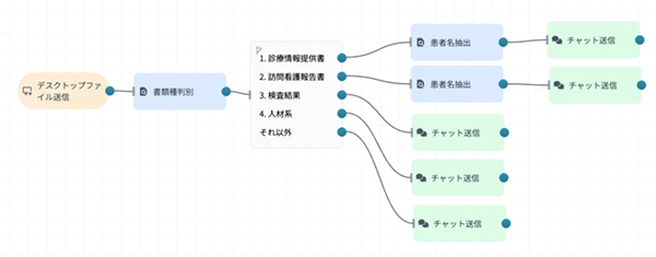 - FAX書類の自動処理:FAXで受信した書類ファイルをデスクトップアプリが検出し,ワークフローに自動送信。AIが書類の種類を判別し,種類に応じた処理や通知先への仕分けを自動で実行。書類仕分け作業の完全な自動化を実現。