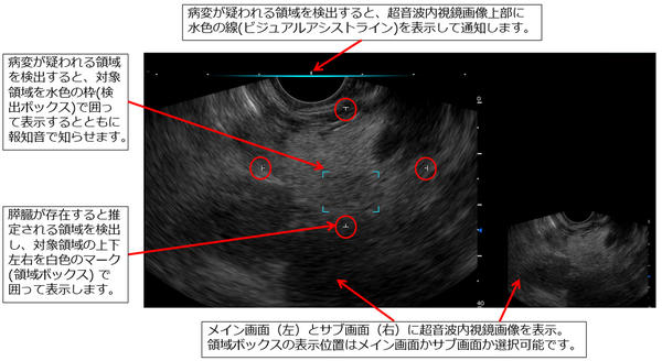 今回同社が開発したソフトウェアは,超音波内視鏡画像を解析することで,膵臓が存在すると推定される領域を表示するとともに,膵充実性病変が疑われる領域をリアルタイムに検出し,その結果をモニターの超音波内視鏡画像上に表示。術者に注意喚起することで膵充実性病変の検出を支援する。