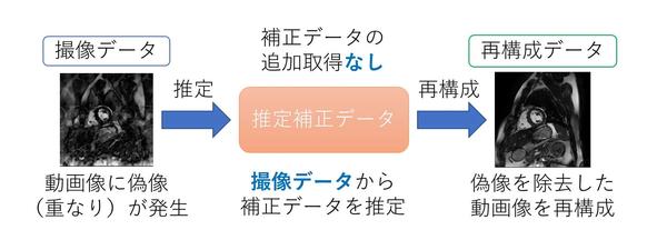 MRI装置による心臓の検査では,心臓の拍動を画像化するシネ撮像と呼ばれる動画撮像が用いられる。シネ撮像には,複数回の撮像をつなぎ合わせる分割撮像と,1回の撮像で画像化するリアルタイムシネ撮像がある。従来の高速撮像方法では高フレームレート化のために,データの収集過程で一部を間引いたうえで,分割撮像をしていた。これには,間引いた撮像データから再構成した画像に生じる偽像(アーチファクト)を除去するために,補正データの追加取得(キャリブレーションスキャン)が必要であった。
