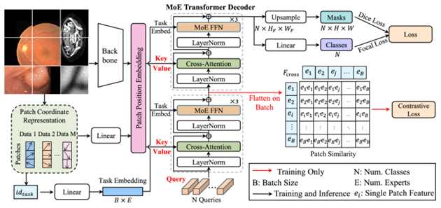 早稲田大学大学院情報生産システム研究科博士後期課程のWang Jiazhe氏,同研究科の吉江 修(よしえおさむ)教授,家入 祐也(いえいりゆうや)講師の研究グループは,この課題に対し,画像を小さな領域(パッチ)に分けたうえで,それぞれのパッチが「どの医用画像データセット(網膜血管,腹部多臓器,など)」に属していて,「どの画像」の,「どの場所」のパッチであるかを3次元で保持する「パッチベースの学習法」と,データ種別ごとに専門的な処理を行う「Mixture of Experts(MoE)」を組み合わせた新手法「PatchMoE」を開発した。体の部位が異なる4種の異なる医療画像を対象に検証を行い,従来手法を上回る精度を実現した。