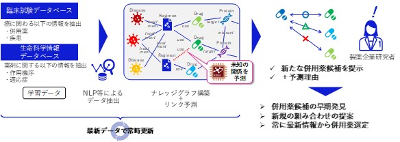 がん治療の選択肢の一つに,2種類以上の薬剤を組み合わせて使用する薬剤併用療法がある。薬剤併用療法は,単剤投与時と比べて高い治療効果が期待される一方,これまで薬剤の組み合わせを予測するためには,膨大な論文や臨床試験データなどをもとに,薬剤の組み合わせ実績や関連する疾患,作用機序(注2),適応症(注3)などの情報を手作業で調査・分析する必要があり,多大な時間を要することが課題であった。