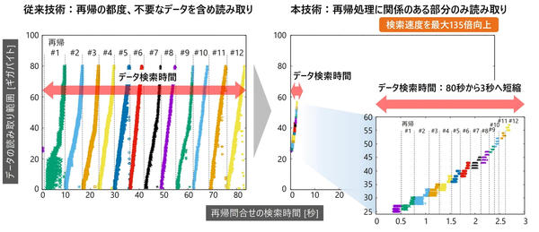 図2 再帰問い合わせ処理におけるデータの読み取り範囲とデータ検索時間の比較