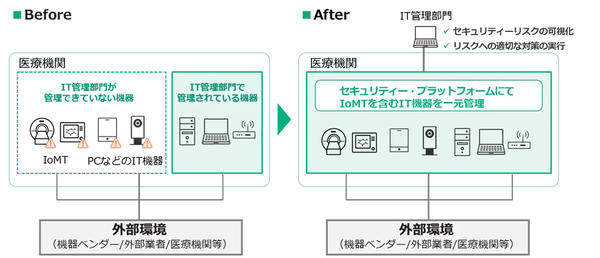 「IT Expert Services IoMTデバイスマネジメントサービス」により,IoMTを含むIT機器を一元管理する。(本サービスの導入前・導入後のイメージ図)
