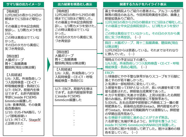 出力されたサマリの文案(左列)を要素ごとに分解して併記し(中央列),各要素に関連するカルテをハイライト表示する(右列)