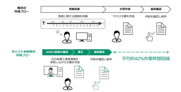 同社は,複数の医師と本技術の有効性を検証。本技術を使用することで,「退院サマリ」の作成に要する時間を平均42%,最大60%短縮できることを確認した。また,検証に協力いただいた医師から,サマリの文案としての妥当性や使いやすさなどの面で高い評価を得た。年間約2万件の「退院サマリ」を作成している大規模病院で導入した場合は年間約2,700時間の作業時間削減効果が期待される*2。