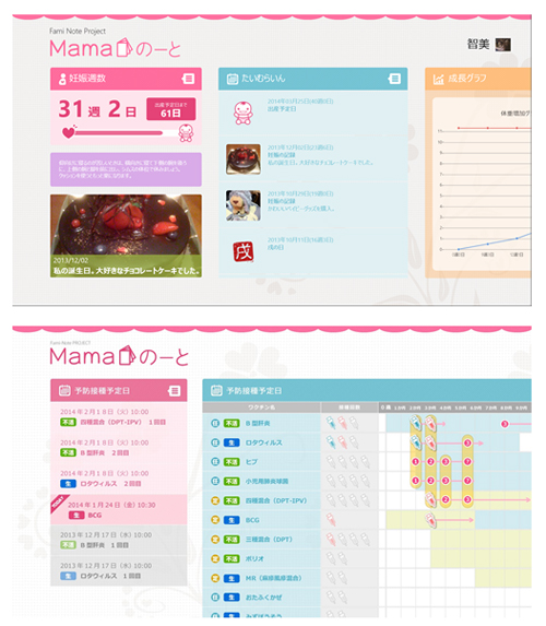 「Mamaのーと」は,妊産婦や育児中の母親が利用する電子母子健康手帳アプリ。現在 Windows ストアで提供されている本アプリでは,従来の母子健康手帳と同様に身長・体重等の基本情報やスケジュールなどを記入し管理できるが,本委員会では,実証研究で収集するデータなどを活用・分析することにより,将来的には,医療機関やデータセンターの電子カルテや予防接種管理システムなどと電子母子健康手帳を連携させることで,タブレットのカメラアプリでワクチンのバーコードを読み取るだけで電子母子健康手帳と電子カルテに即時登録できるようにするなど,妊産婦と医療機関の手間を省き,より安全性を高めるための,より高度な活用にも取り組む。