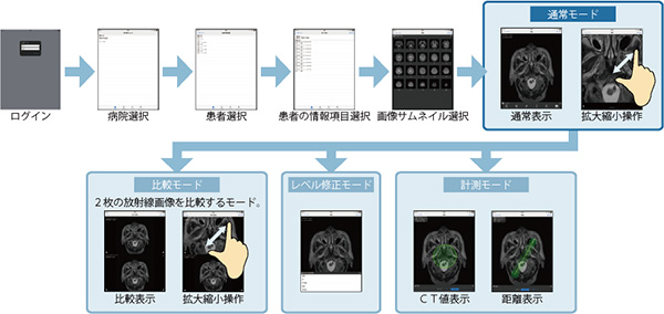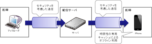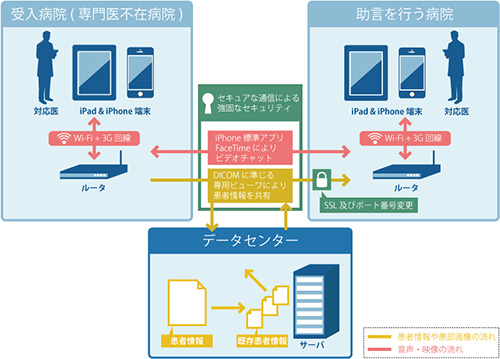 「XMIX」は,iPadやiPhoneなどのiOS端末と専用のサーバシステムで構成されており,これらをApple社のFaceTimeと専用開発した放射線画像情報ビューアで情報共有を行う。これにより離れた場所に居る専門医等からの助言を可能にしている。また,各通信経路は独自の技術で強固なセキュリティを確保している。