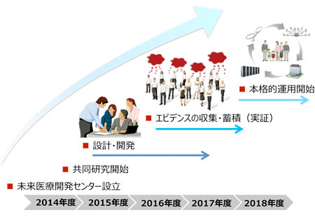 この実績に基づく技術とノウハウを,政府の日本再興戦略のテーマの1つである「国民の健康寿命が延伸する社会の実現」に活かすため,2013年12月に未来医療開発センターを設立した。同センターでは,ICT活用による国民の健康増進,重症化予防,疾患の早期発見,新薬創出,個別化医療などの実現について,国内外の高度医療研究機関や専門家と検討を重ねてきており,今回,4つの高度医療研究機関それぞれと,共同研究に関する協定を締結した。