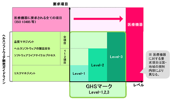 GHS開発ガイドラインは,推奨される4つの要求事項「リスクマネジメント」「品質マネジメント」「ヘルスソフトウェアの製品安全」「ソフトウェアライフサイクルプロセス」から構成されており,法規制対象外のヘルスソフトウェア開発やヘルスソフトウェア事業への新規参入者が段階を追ってスキルを高めることができるように3つの適合レベルを設定している。なお,法規制対象外のヘルスソフトウェアの安全を実現するにあたって,リスク分析を含むリスクマネジメントは不可欠であるため,リスクマネジメント要求への対応は ガイドライン適合レベル Level-1~3 のすべてに必要としている。